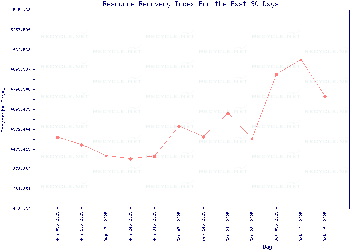 The Index includes snapshots of 5 viewpoints of market trends: the past 7 days, past 30 days, past 90 days, past 1 year and past 2 years. The Resource Recovery Composite Index launched January 1, 2011 and no market trend data is available prior to that date. In June 2019 the Resource Recovery Composite Index was re-balanced to reflect current market trends.